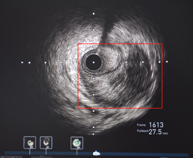 随后,患者立即被送往导管室,揭主任携副主任医师蒋溢为迅速给患者完成了冠脉造影,术中见患者左主干明显变窄,回旋支闭塞,血流TIMI0级,前降支次全闭塞,血流TIMI1级。但此时尚未能明确患者是否为冠脉痉挛或冠脉自发夹层,揭英纯和蒋溢为副主任医师当机立断,为患者快速完成了血管内超声检查,原来是冠状动脉自发夹层!考虑到患者冠脉已经闭塞,遂在IVUS指导下选择切割球囊精准对闭塞血管进行切割扩张,恢复回旋支及前降支正常血流。